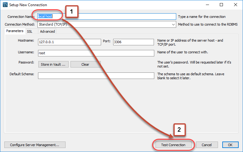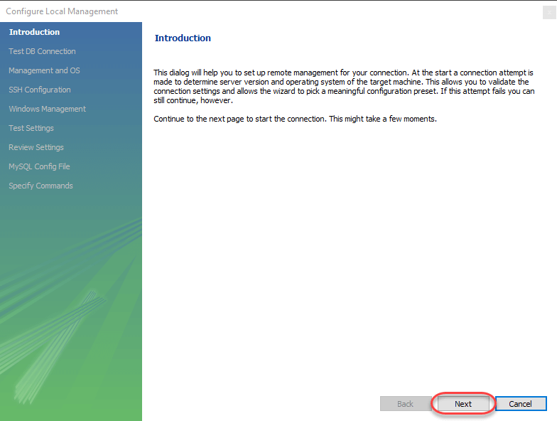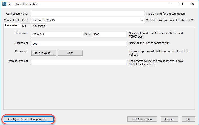 3. As a beginner you can create a connection for a locally installed server. Click Configure Server Management button in Setup New Connection window to check the cofiguration of the MySQL server.