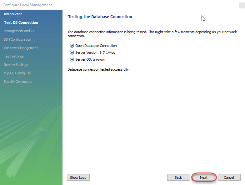 6. Next the Wizard will test connections to database. If test fails, go back and correct database connection parameters. Else if all tests are sucessful click Next to continue.