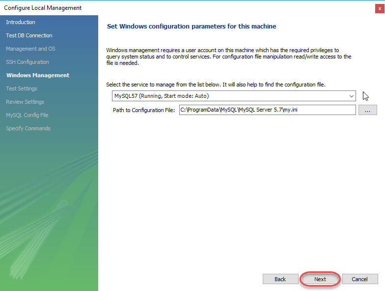 8. The Wizard will then check ability to access MySQL Server Configuration File, and test start/stop commands.