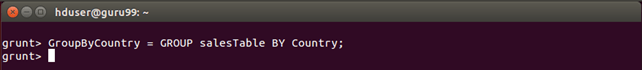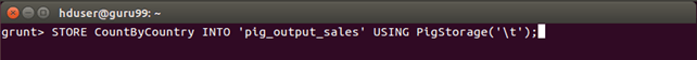 CountByCountry = FOREACH GroupByCountry GENERATE CONCAT((chararray)$0,CONCAT(':',(chararray)COUNT($1)));Press Enter after this command.