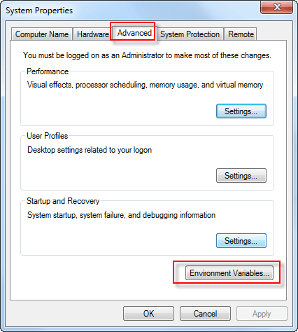 Step 2) System Properties window display, select tab Advanced -> Environment Variables