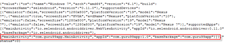 So the URL to check the Android target version is changed to: http://localhost:5555/wd/hub/status