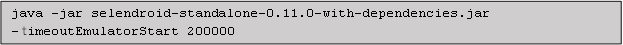 By default, Selendroid will wait 300,000 milliseconds until the emulator starts. You can change to new timeout (200,000 ms) by command