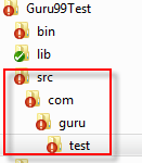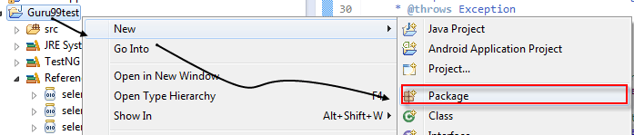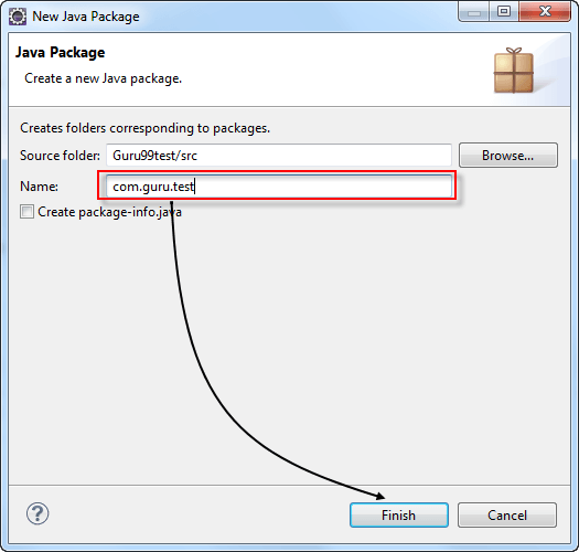 Type com.guru.test to the Name field on New Java Package dialog à Finish