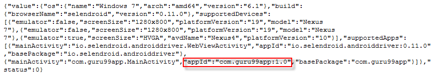 To create a new test session with Selendroid, you have to provide the app id in the format: com.gtupapersapp:1.0. This app Id can is identified in step 6. If you don't set the app Id matching the Android device, the test session will throw an error and will not start.