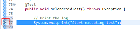 After the Selendroid Server started, open the sample test project gtupaperstest on Eclipse, set a breakpoint at line 77 on file gtupapersTest.java by double click to the line 77 -> A dot will display like below
