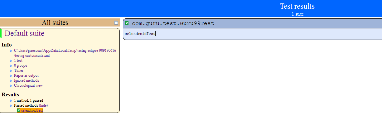 Step 12) After test finishes execution, TestNG auto generates the test report as following