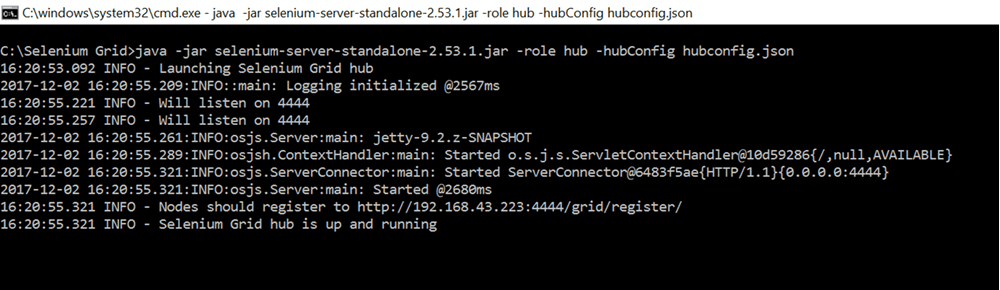 java -jar selenium-server-standalone-2.53.1.jar -role hub -hubConfig hubconfig.json