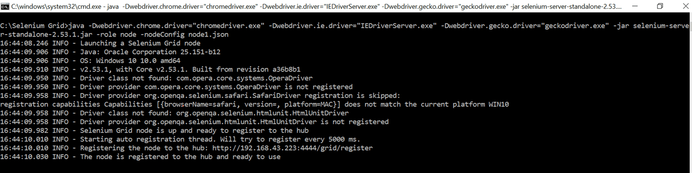 Java-Dwebdriver.chrome.driver="chromedriver.exe" -Dwebdriver.ie.driver="IEDriverServer.exe" -Dwebdriver.gecko.driver="geckodriver.exe" -jar selenium-server-standalone-2.53.1.jar -role node -nodeConfig node1.json