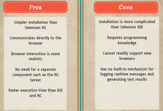 The WebDriver proves itself to be better than both Selenium IDE and Selenium RC in many aspects. It implements a more modern and stable approach in automating the browser's actions. WebDriver, unlike Selenium RC, does not rely on JavaScript for Selenium Automation Testing. It controls the browser by directly communicating with it.