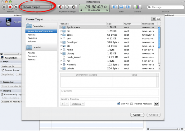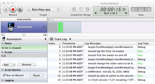 In Instruments window, select Automation Instrument To create a test script, you either record a Test Scenario or you program it manually.In this case, I will use Apple's sample SimpleDrillDown simple app as an application under test. It has GUI below.