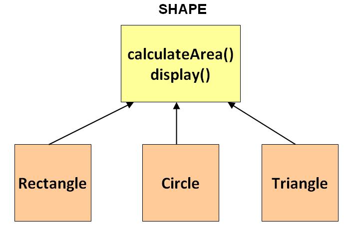Consider the following class hierarchy consisting of a Shape class which is inherited by three classes Rectangle, Circle, and Triangle. The Shape class is created to save on common attributes and methods shared by the three classes Rectangle, Circle, and Triangle. calculateArea() is one such method shared by all three child classes and present in Shape class.