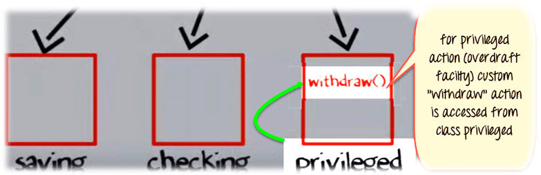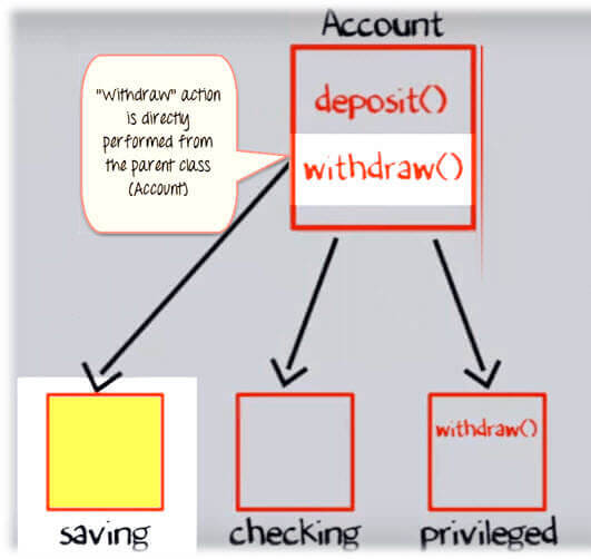 So, withdraw method for privileged needs to implemented afresh. But you do not change the tested piece of code in Savings and Checking account. This is advantage of OOPS