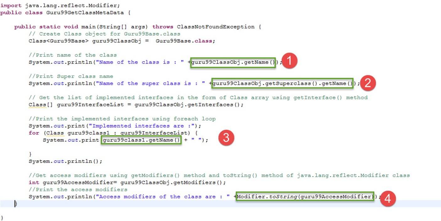 Following example shows how to get metadata such as: Class name, super class name, implemented interfaces, and access modifiers of a class.