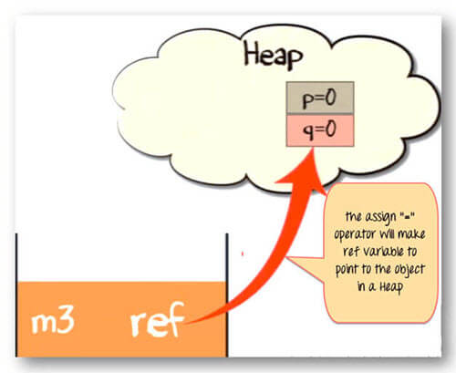 The assignment "=" operator will make a reference variable to point to the object in the Heap.