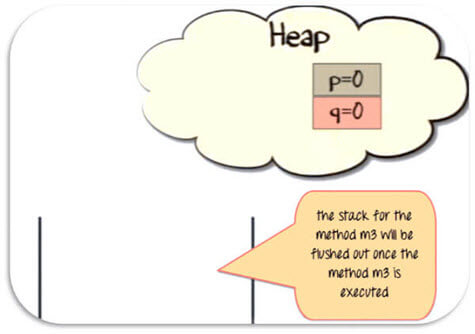 Now let say our method m3 is creating an object for class "Account," which has two instances variable int p and int q.