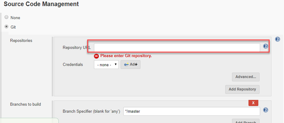 Step 8) Once you have everything in place, try adding the Git URL into Jenkins. You will not see any error messages for Jenkins Git integration: