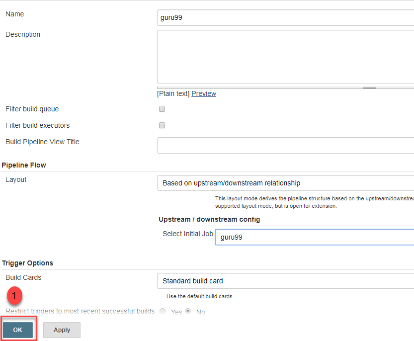 Step 3) In the next page, you will be asked for some more details to configure your Jenkins pipeline. Just accept the default settings, and make sure you choose the first job under the settings.