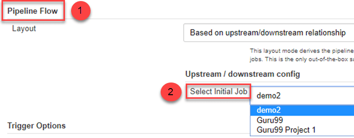Under Pipeline flow, select the initial job to run. Now choose the job which has chains to other jobs, as shown in Step 1 and Step 2.