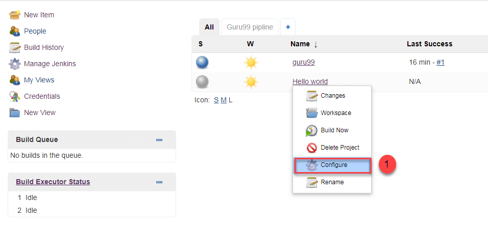 Step 1) For running a pipeline build, you need to chain your jobs first. For this, go to your first job and click on configure.