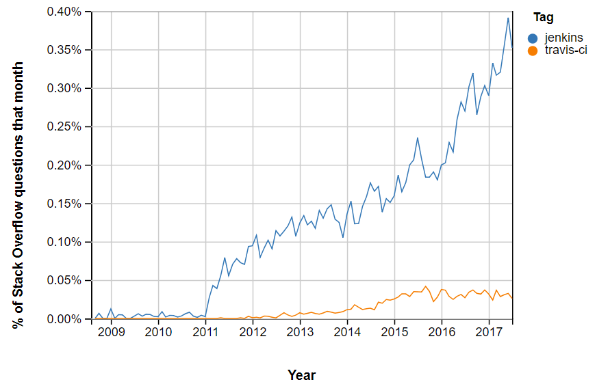 The number of questions labeled Jenkins and Travis in Stack Overflow.