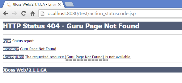 <%@ page language="java" contentType="text/html; charset=ISO-8859-1" pageEncoding="ISO-8859-1"%> <!DOCTYPE html PUBLIC "-//W3C//DTD HTML 4.01 Transitional//EN" "http://www.w3.org/TR/html4/loose.dtd"> <html> <head> <meta http-equiv="Content-Type" content="text/html; charset=ISO-8859-1"> <title>Guru Status Code</title> </head> <body> <% response.sendError(404,"Guru Page Not Found"); %> </body> </html>