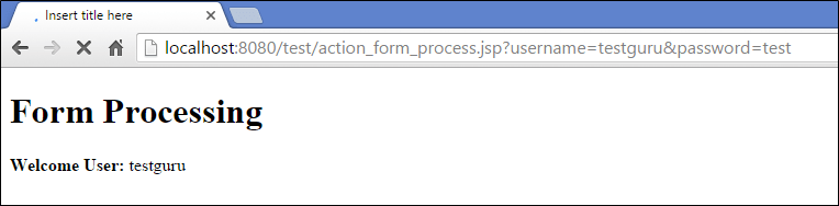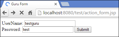 <%@ page language="java" contentType="text/html; charset=ISO-8859-1" pageEncoding="ISO-8859-1"%> <!DOCTYPE html PUBLIC "-//W3C//DTD HTML 4.01 Transitional//EN" "http://www.w3.org/TR/html4/loose.dtd"> <html> <head> <meta http-equiv="Content-Type" content="text/html; charset=ISO-8859-1"> <title>Guru Form</title> </head> <body> <form action="action_form_process.jsp" method="GET"> UserName: <input type="text" name="username"> <br /> Password: <input type="text" name="password" /> <input type="submit" value="Submit" /> </form> </body> </html>