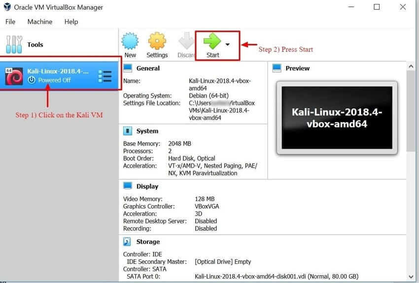 Step 8) Click on the Kali Linux VM within the VirtualBox Dashboard and click Start, this will boot up the Kali Linux Operating System.