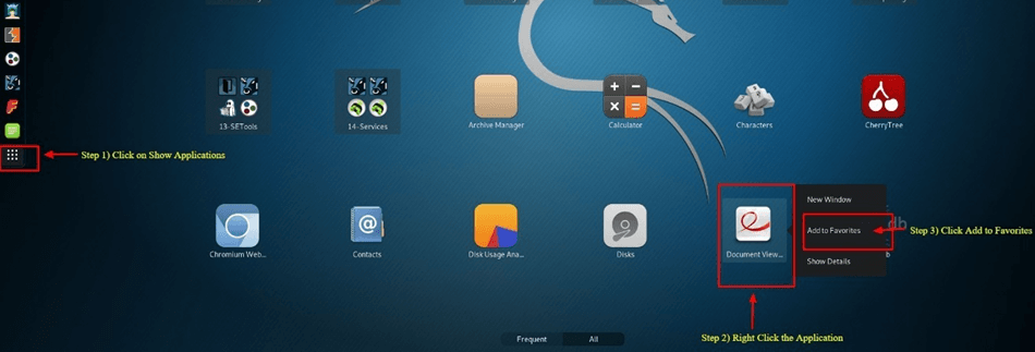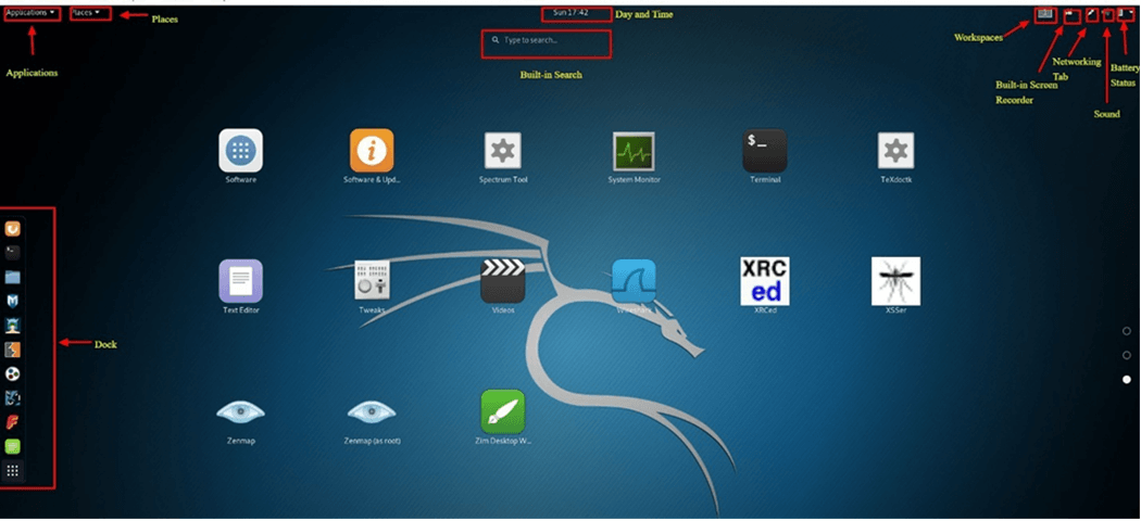 Kali Linux Dock – Similar to Apple Mac's Dock or Microsoft Windows Task Bar, the Kali Linux Dock provides quick access to frequently used / favorite applications. Applications can be added or removed easily.