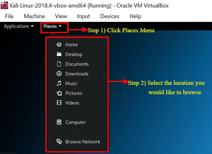 Places Tab – Similar to any other GUI Operating System, such as Windows or Mac, easy access to your Folders, Pictures and My Documents is an essential component. Places on Kali Linux provides that accessibility that is vital to any Operating System. By default, the Places menu has the following tabs, Home, Desktop, Documents, Downloads, Music, Pictures, Videos, Computer and Browse Network.
