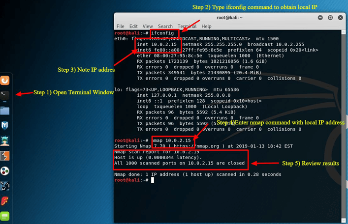 Step 2) The Terminal window should open, enter the command ifconfig, this command will return the local IP address of your Kali Linux system. In this example, the local IP address is 10.0.2.15