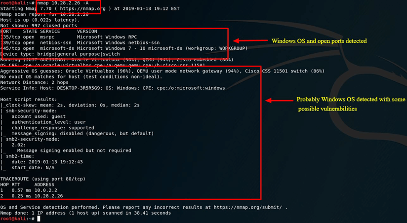 Another basic but useful feature of nmap is the ability to detect the OS of the host system. Kali Linux by default is secure, so for this example, the host system, which Oracle's VirtualBox is installed on, will be used as an example. The host system is a Windows 10 Surface. The host system's IP address is 10.28.2.26.