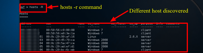 Step 1) Assuming Metasploit is still open enter Hosts -R in the terminal window. This adds the hosts recently discovered to Metasploit database.