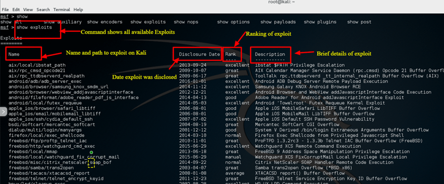 Step 2) Enter "show exploits", this command will provide a comprehensive look at all the exploits available to Metasploit.