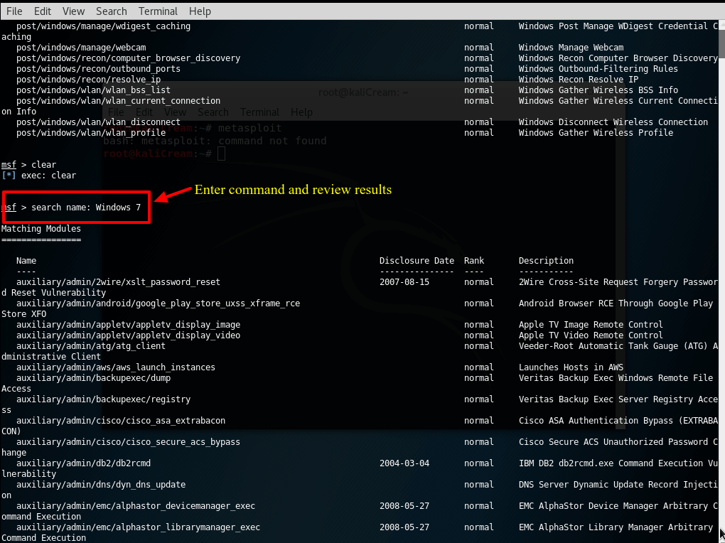 Step 3) Now, try to narrow down the list with this command: search name: Windows 7, this command searches the exploits which specifically include windows 7, for the purpose of this example we will try to exploit a Windows 7 Machine. Depending on your environment, you will have to change the search parameters to meet your criteria. For example, if you have Mac or another Linux machine, you will have to change the search parameter to match that machine type.