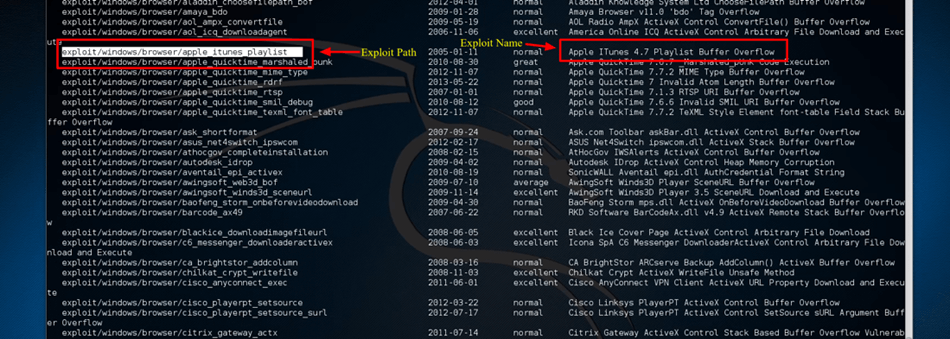 Step 4) For the purposes of this tutorial we will use an Apple Itunes vulnerability discovered in the list. To utilize the exploit, we must enter the complete path which is displayed in the list: use exploit/windows/browse/apple_itunes_playlist