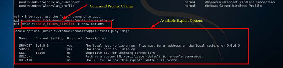 Step 6) Enter show options to review what options are available to the exploit. Each exploit will, of course, have different options.