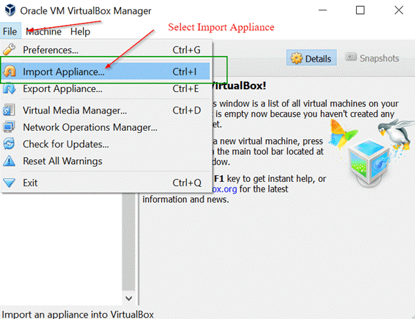 Step 2) Open the Oracle VirtualBox Application, and from the File, Menu select Import Appliance