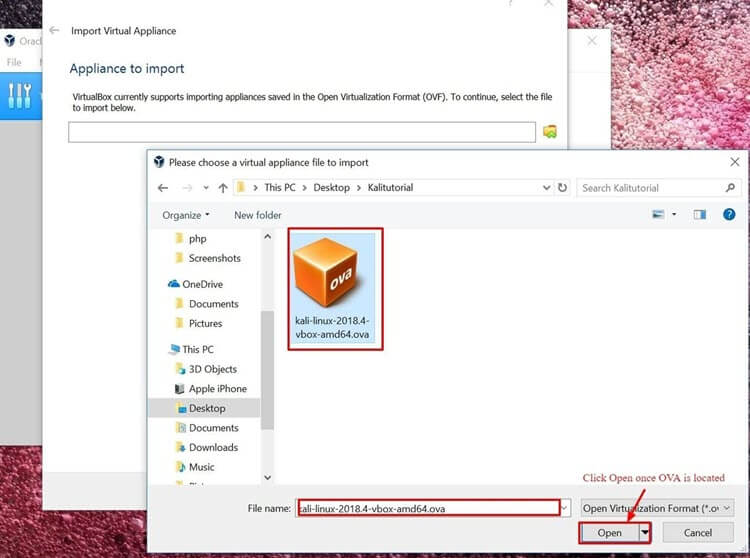 Step 3) On the following screen "Appliance to Import" Browse to the location of the downloaded OVA file and click Open