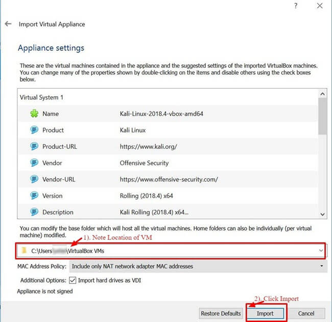 Step 5) The following screen "Appliance Settings" displays a summary of the systems settings, leaving the default settings is fine. As shown in the screenshot below, make a note of where the Virtual Machine is located and then click Import.