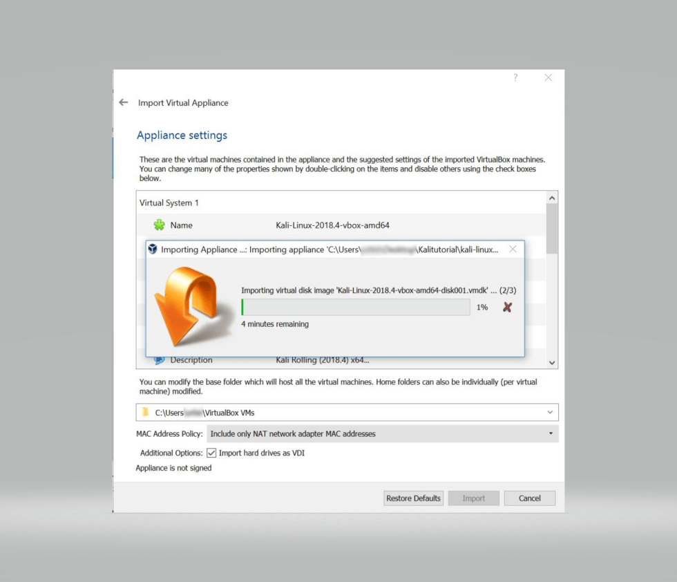 Step 6) VirtualBox will now Import the Kali Linux OVA appliance. This process could take anywhere from 5 to 10 minutes to complete.