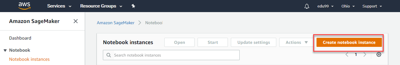 Open the Amazon Sagemaker console and click on Create notebook instance.