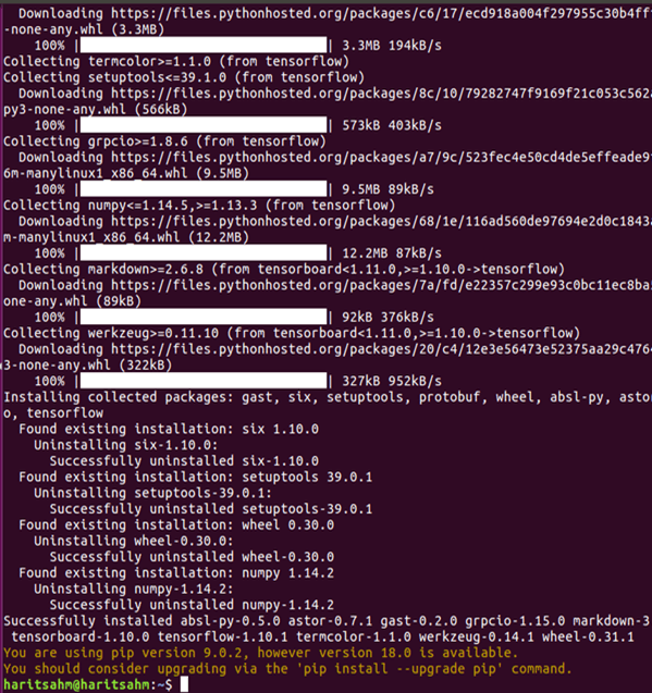 user@user:~$ python Python 3.6.4 (default, Mar 20 2018, 11:10:20) [GCC 5.4.0 20160609] on linux Type "help", "copyright", "credits" or "license" for more information. >>> import tensorflow >>>