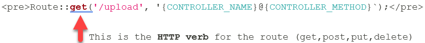 The second argument to both the Route::get() and Route::post() method (and any of the other HTTP-verb-related methods on the Route facade), is the name of a specific Controller and method housed inside that controller that gets executed upon hitting the route's endpoint with the allowed HTTP request (GET, POST, PATCH, etc.) We are using the UploadController for all three routes and have specified them in the following fashion: