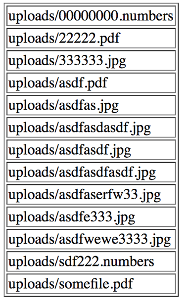 Go ahead and try it out and submit a few files to the application using this form. Afterward, navigate to the /list page to see the contents of the upload folder, with the files you uploaded listed in a table: