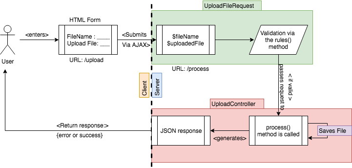 The request object gets populated by associating the parameters inside the rules() method with the submitted form parameters, then validates the data according to each specified rule. If all the rules are satisfied, the request gets passed along to whatever controller method that corresponds to the values defined in the route file web.php. In this case, it is the process() method of the UploadController that does the work. Once we hit the controller, we already know that the request passed validation so we don't have to re-test if the filename given is, in fact, a string or the userFile parameter actually holds some type of file... We can continue as normal.
