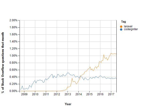 | Popularity & current trends | Laravel is at its peak popularity right now. With its expressive coding style favored by the seasoned developers. | It offers ease of use in 2.x, and therefore most web developers prefer CodeIgniter. |
