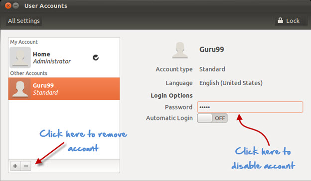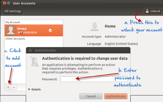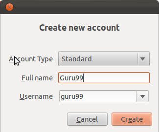 Step 3) A new window would pop up, asking you for adding information to the new user account.The account type offers two choices - standard and administration(Ubuntu Limitation). If you want the new user to have administrative access to the computer, select Administrator as the account type. Administrators can do things like add and delete users, install software and drivers, and change the date and time. Otherwise, choose standard.Fill in the full name, username and click on create.