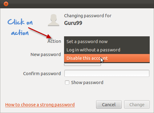 Step 2) For disabling click on the area where the password is stored, and you would get the following prompt. Select disable this account and click on change.