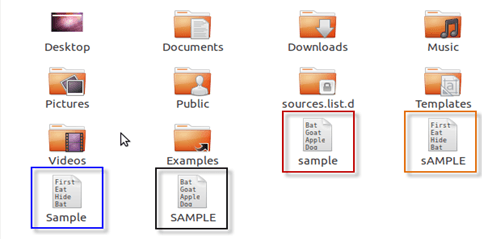 | In Windows, you cannot have 2 files with the same name in the same folder | Linux file naming convention is case sensitive. Thus, sample and SAMPLE are 2 different files in Linux/Unix operating system. |